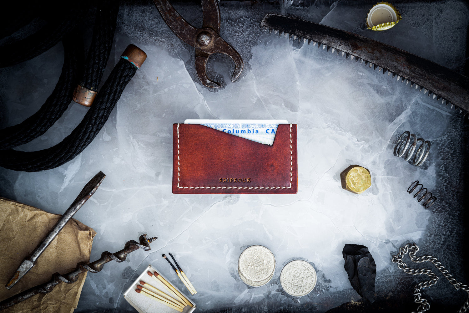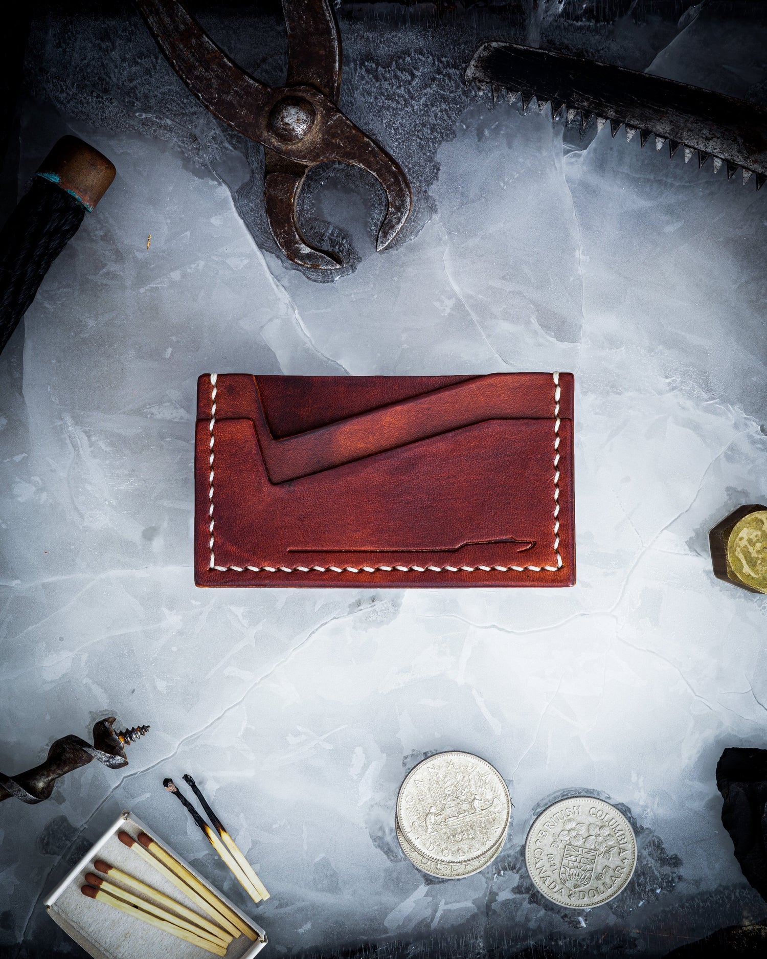 Handmade with quality veg tan leather and hand stitched with waxed thread, the Amber Cardholder comfortably fits 6-8 cards plus a few folded bills or receipts in the front most pocket. Given to a unique, rich patina.