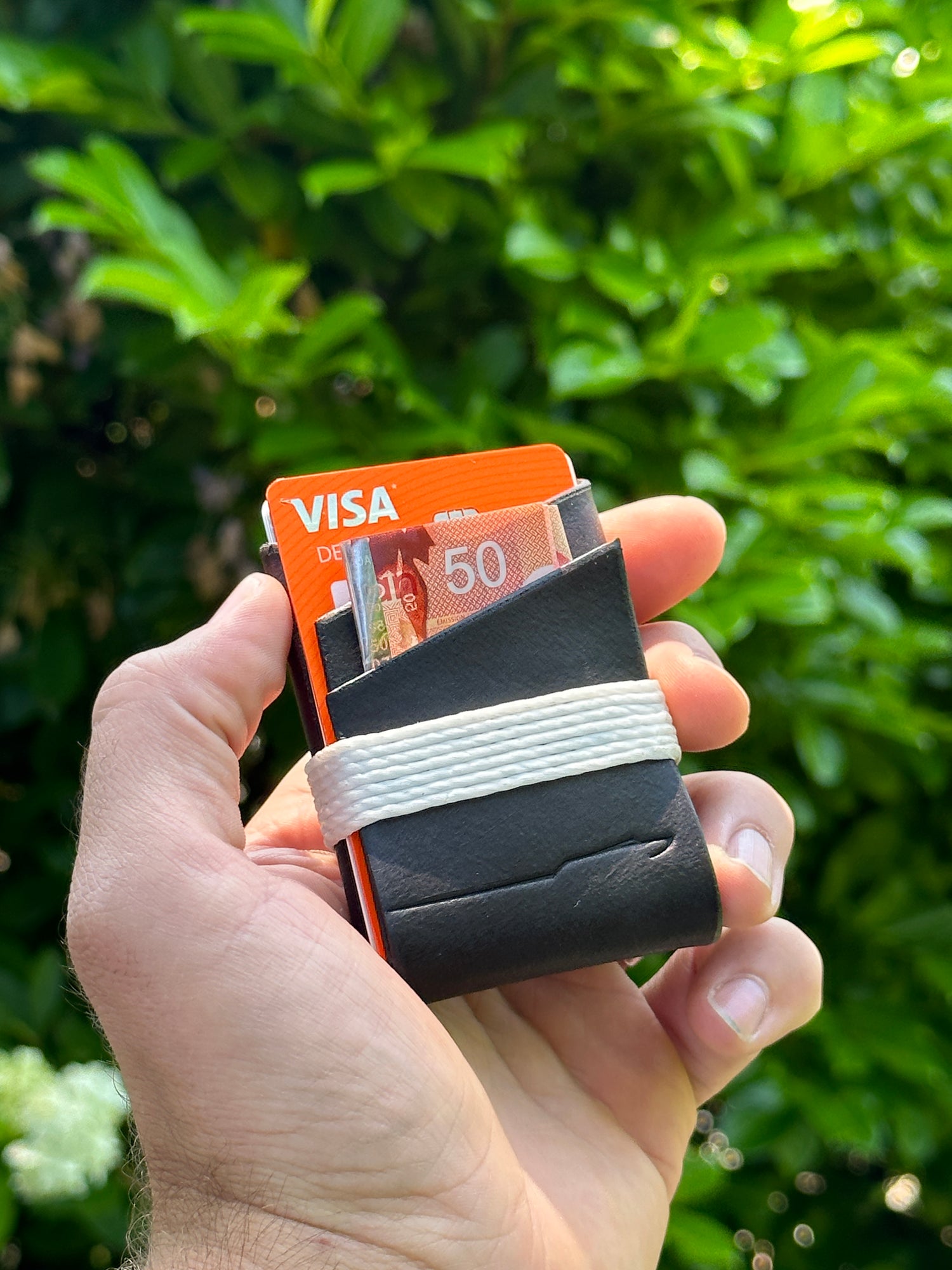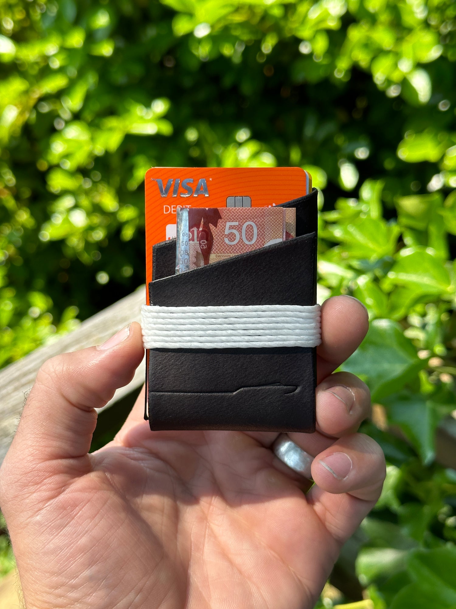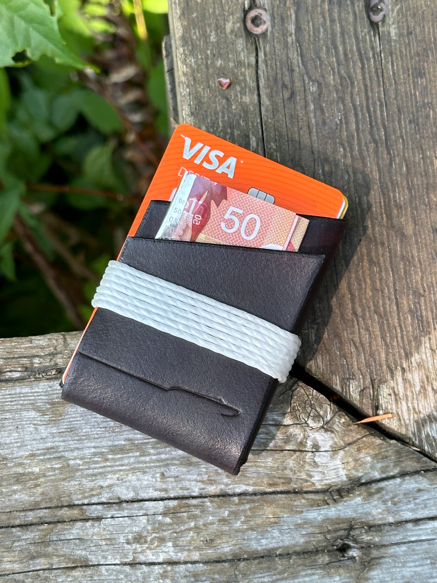 Handmade with quality veg tan leather and lashed with waxed thread, the Deckhand Stitch-less Cardholder in Dark Granite comfortably fits 6-8 cards plus a few folded bills or receipts in the front most pocket. Given to a unique, rich patina.