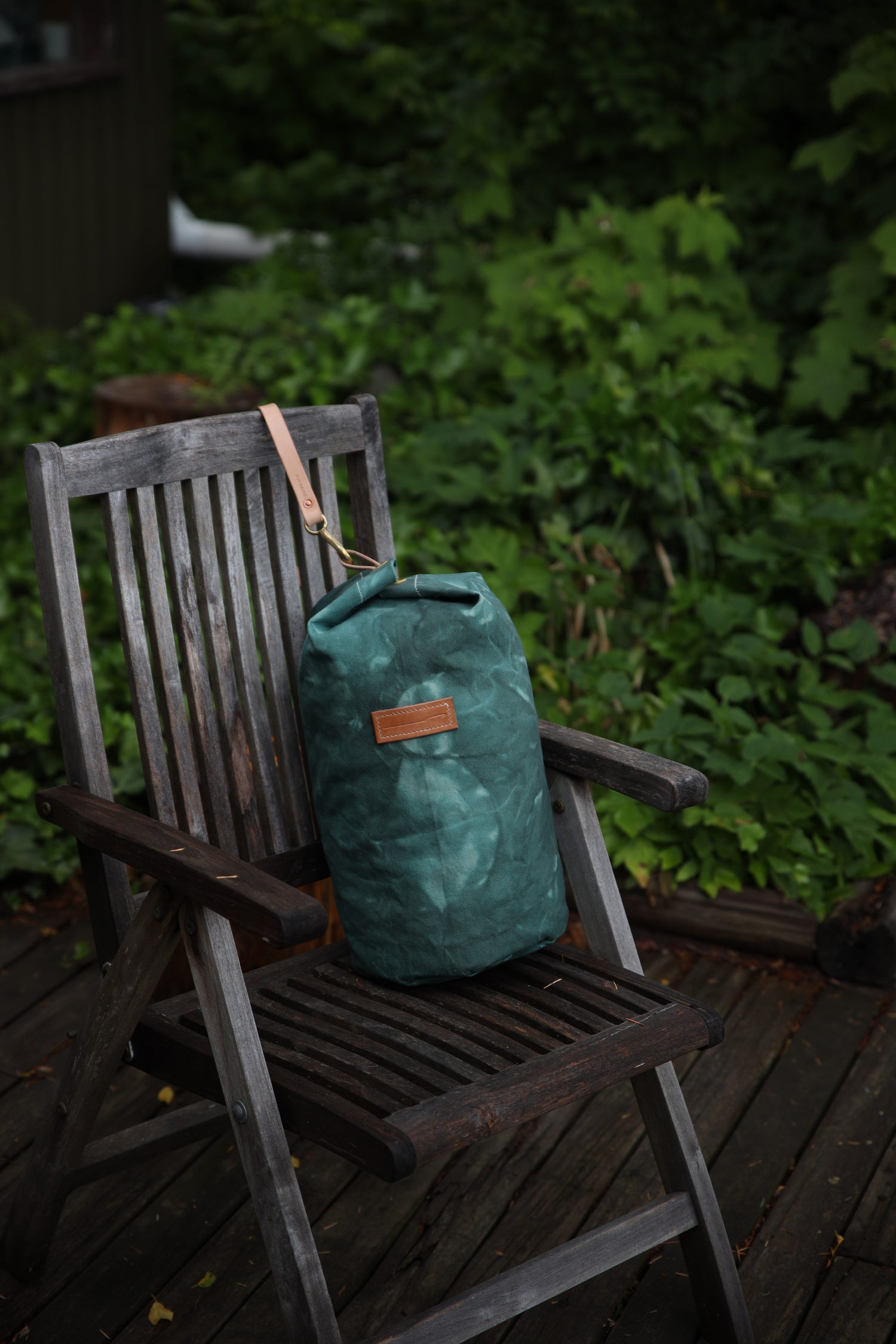 The Runabout in Emerald Waxed Canvas and Veg Tan Leather with Pre-added Patina